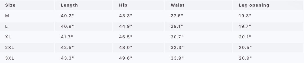 | Size | Length | Hip | Waist | Leg opening |